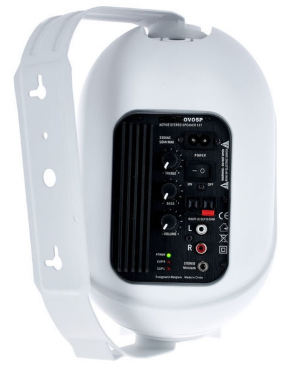 BIAMP OVO5P-W – комплект из активной и пассивной акустических систем (стерео пара), выделяющихся элегантным дизайном, высококачественным звуком и весьма доступной ценой. Каждая из АС снабжена высокоэффективной связкой из 5.25" НЧ вуфера с бумажным диффузором и 1" ВЧ твитера с шелковым куполом, которые в паре с встроенным в активную АС усилителем обеспечивают выходную мощность на уровне RMS 2х20 Вт и звуковое давление до 101 дБ. Также активный громкоговоритель снабжен стерео аудио входами на 2RCA и mini-jack 3.5 мм, поворотными регуляторами настройки тембра Bass/Treble и управления громкостью выходного сигнала. Питание реализовано от стандартной бытовой электросети AC 230 В. Дополнительно предусмотрена система защиты от перегрузок и информативная световая индикация текущего состояния. АС выпускается в лаконичном корпусе из высокопрочного АБС-пластика с защитной сеткой из стали с порошковым покрытием и предполагает настенный накладной монтаж с применением комплектного наклонно-поворотного кронштейна ли же просто размещение на любой горизонтальной поверхности.