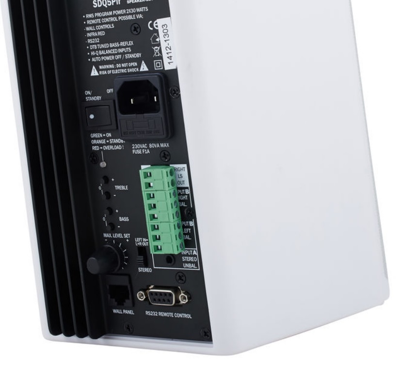 BIAMP SDQ5PIR-W – комплект из активной и пассивной акустических систем (стерео пара), выделяющихся элегантным дизайном, высококачественным звуком, широкими возможностями управления и весьма доступной ценой. Каждая из АС снабжена высокоэффективной связкой из 5.25" НЧ вуфера с полипропиленовым диффузором и 1" ВЧ твитера с шелковым куполом, которые в паре с встроенным в активную АС усилителем обеспечивают выходную мощность на уровне RMS 2х15 Вт (max 2х30 Вт) и звуковое давление до 101 дБ. Также активный громкоговоритель снабжен стерео аудио входом на mini-jack 3.5 мм, балансным аудио входом на 2хEuroblock 3-pin, поворотными регуляторами настройки тембра Bass/Treble и управления громкостью выходного сигнала, ИК-портом для управления с пульта ДУ, портами RS232 для интеграции в автоматизированные аудиосистемы и RJ45 для управления с панелей ACP/ACPL/ACPR. Питание реализовано от стандартной бытовой электросети AC 230 В. Дополнительно предусмотрена система защиты от перегрузок и информативная световая индикация текущего состояния. АС выпускается в лаконичном корпусе из высокопрочного АБС-пластика с защитной сеткой из стали с порошковым покрытием и предполагает настенный накладной монтаж с применением комплектного наклонно-поворотного кронштейна ли же просто размещение на любой горизонтальной поверхности.