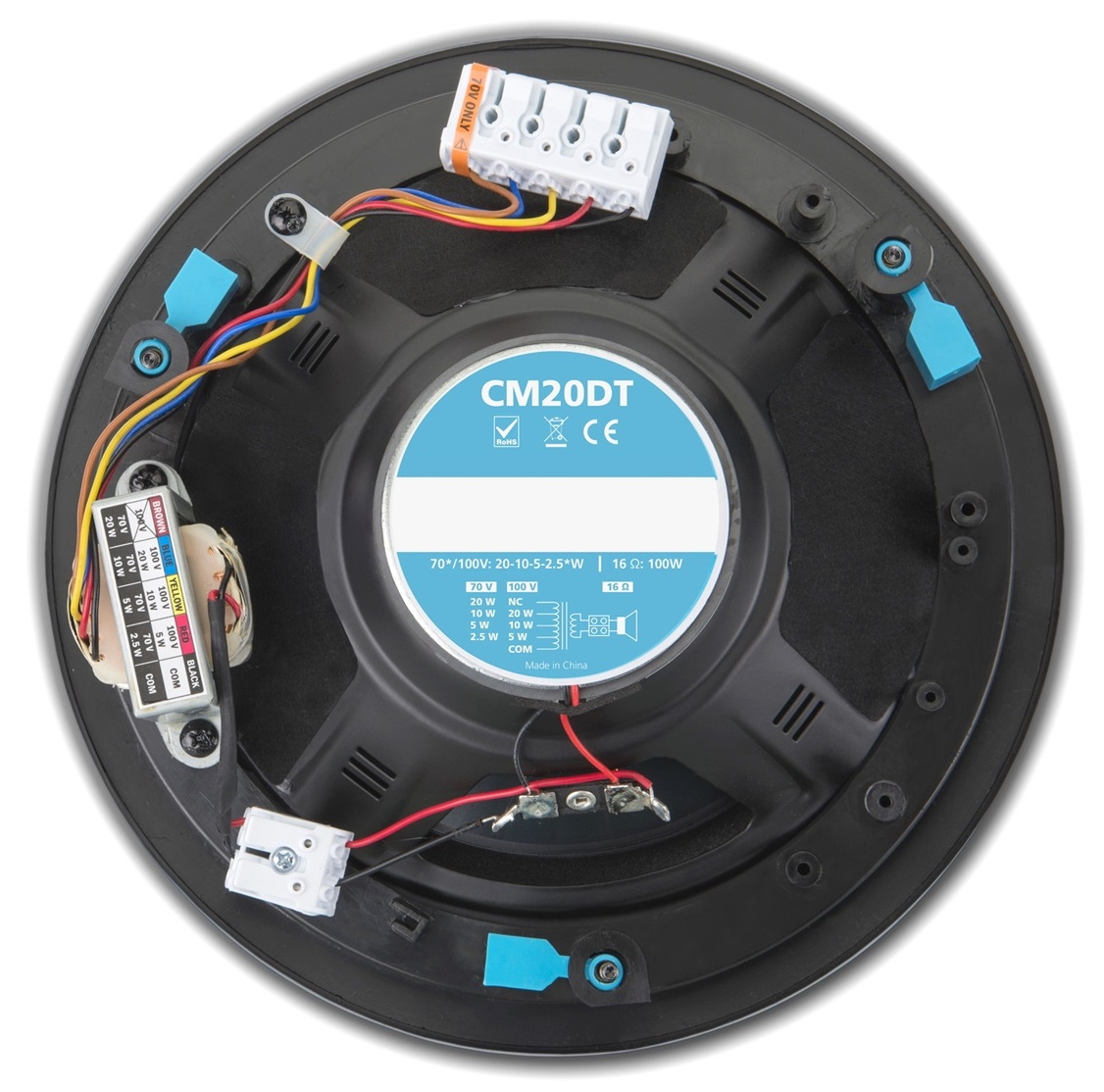 BIAMP CM20DT – двухполосная акустическая система для врезного монтажа в потолочные или стеновые фальш-конструкции. Она оборудована высокоэффективной связкой из 6.5" НЧ вуфера с диффузором из усиленного пропилена и 1" ВЧ твитера, которые обеспечивают выходную мощность на уровне RMS 30 Вт (peak 60 Вт) при подключении 16 Ом и 20/10/5 (2.5) Вт при работе в линиях 100 (70) В. Звук получается теплым и глубоким, возможные шумы и помехи сводятся к минимуму.