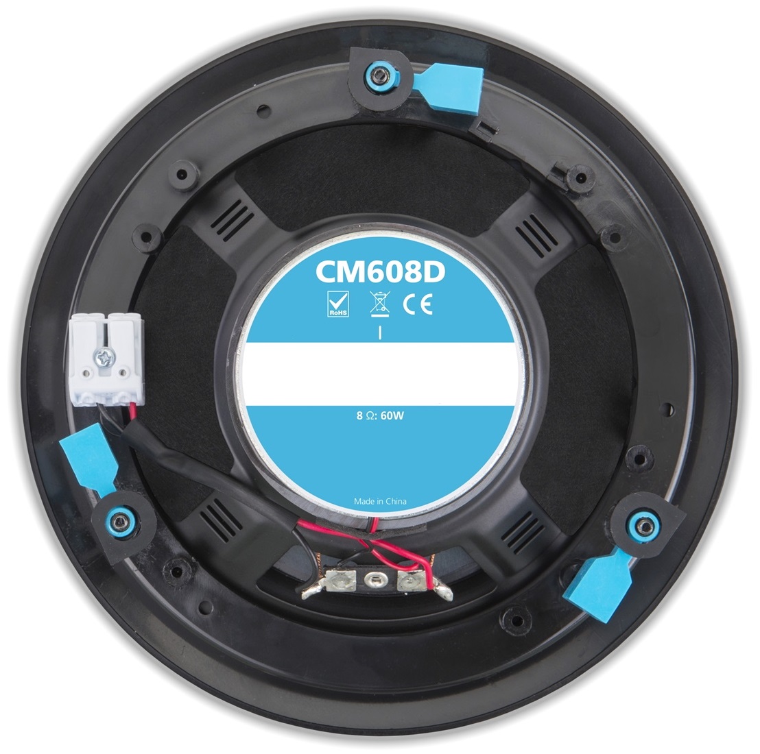 BIAMP CM608D – двухполосная акустическая система для врезного монтажа в потолочные или стеновые фальш-конструкции. Она оборудована высокоэффективной связкой из 6.5" НЧ вуфера с диффузором из усиленного пропилена и 1" ВЧ твитера, которые обеспечивают выходную мощность на уровне RMS 40 Вт (peak 60 Вт) и звуковое давление ≤104 дБ. Имеет импеданс 8 Ом и подключается исключительно к низкоомным выходам оборудования (до 2 шт. на 1 выход 4 Ом). Для работы с трансляционным оборудованием необходима доукомплектация опциональным согласующим трансформатором T60/T20 или аналогичным.
