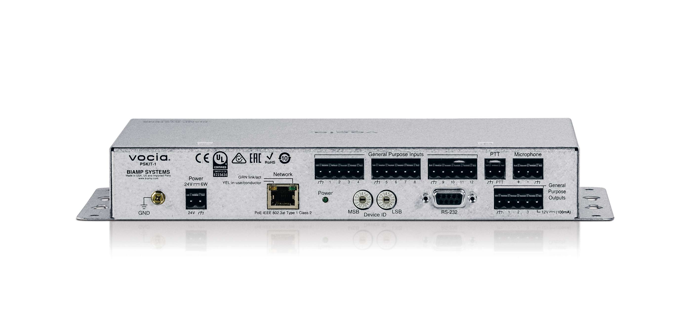 BIAMP Vocia PSKIT-1 — это cетевой модуль для подключения в систему оповещения на базе оборудования серии Vocia микрофонов, пейджинговых станций или консолей любых производителей. Встроенный DSP процессор для обработки сигнала (настраивается через ПО: чувствительность, фильтры частот, компрессор или лимитер). Обмен аудиопотоками происходит через сетевой протокол CobraNet. Предусмотрена энергонезависимая память, где хранится до 999 пейджинговых кодов, а также настройки прибора.