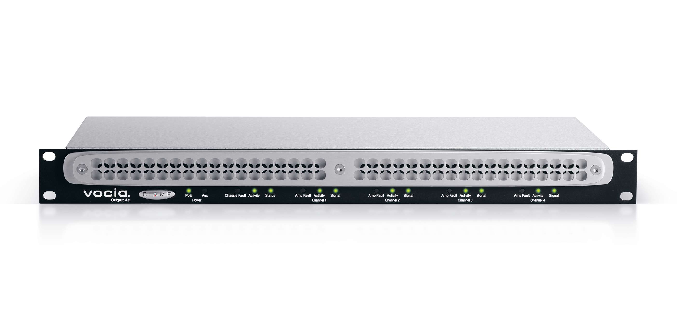 BIAMP Vocia VO-4e — это четырехканальный cетевой расширитель аудиовыходов для системы оповещения на базе оборудования серии Vocia. ЦАП преобразует цифровой сигнал в аналоговый. Встроенный DSP процессор для обработки сигнала (настраивается через ПО: управление громкостью звука, определение приоритетности сигнала, эквалайзер, компрессор или лимитер, кроссоверы, задержку сигнала и его выходное усиление). Обмен аудиопотоками с подключенными приборами происходит через сетевой протокол CobraNet. Предусмотрено 2 разъёма RJ-45 (основной и резерв).
