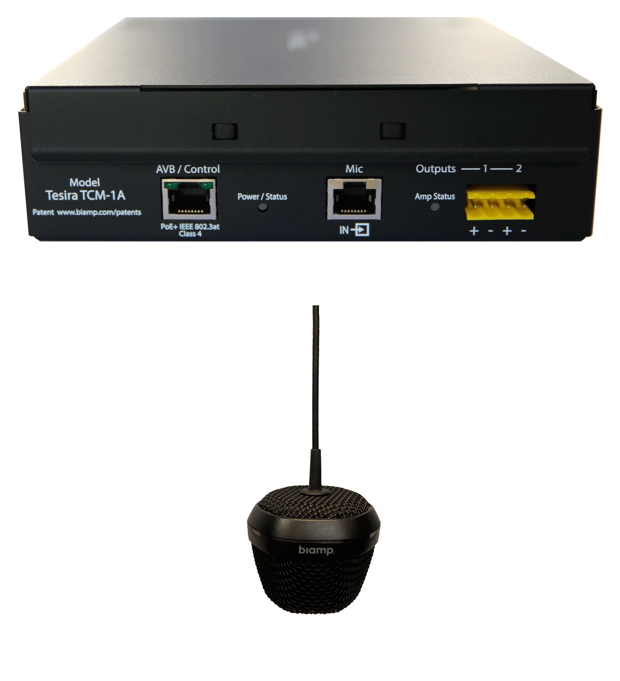 Обмен данными внутри системы (звук, управление) ведется по стандартам AVB через локальную сеть Ethernet. В случае приглушения звука (отключения) загорается светодиодный индикатор Mute. Разъём RJ45 позволяет последовательно подключить к основному микрофону аналогичный ему дополнительные TCM-1EX (до 3-х штук последовательно), которые будут управляться и питаться от основного.