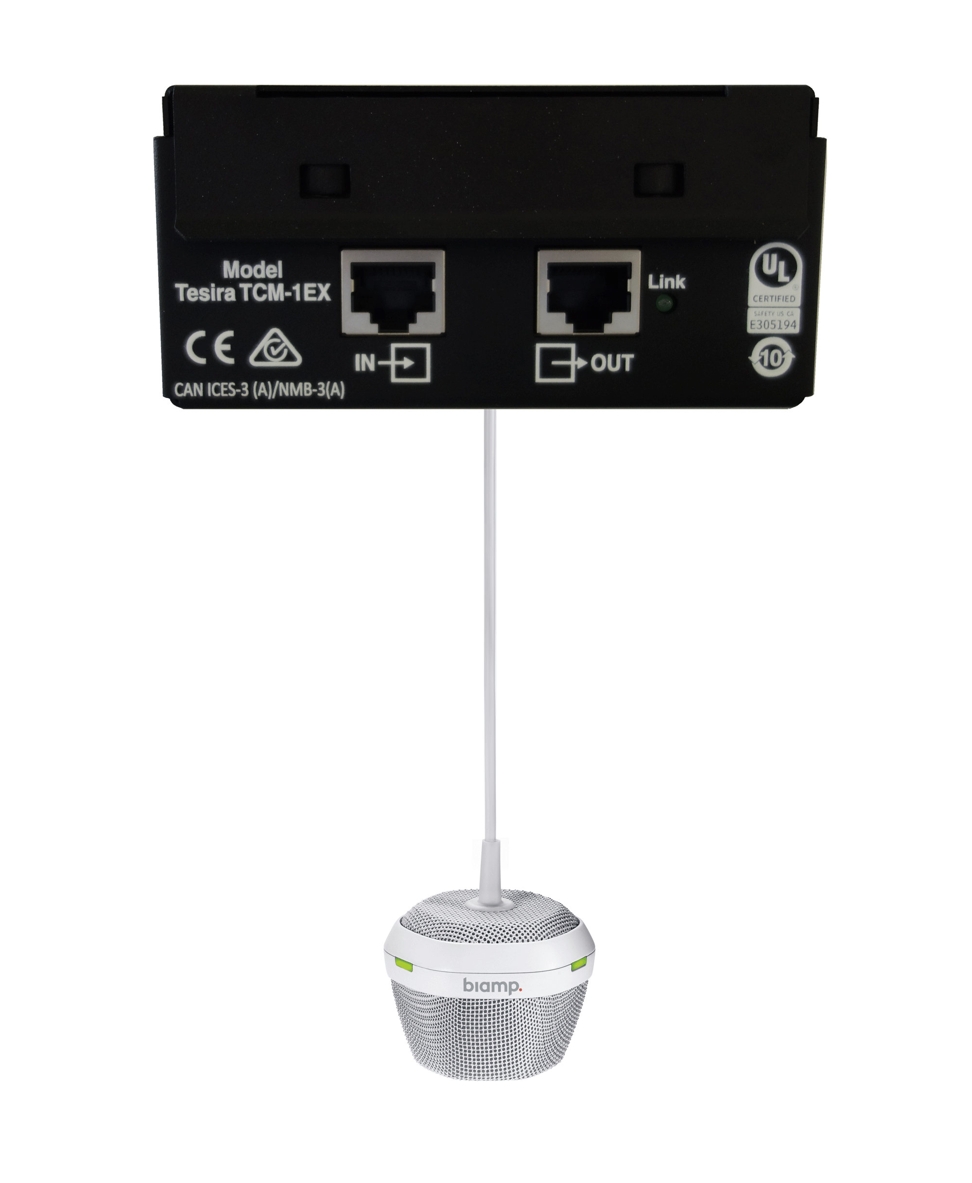 Обмен данными внутри системы (звук, управление) ведется по стандартам AVB через локальную сеть Ethernet. В случае приглушения звука (отключения) загорается светодиодный индикатор Mute. Разъёмы 2*RJ45 для подключения к устройствам. Материал исполнения микрофона ABS-пластик с защитной стальной сеткой белого цвета. Питание по технологии PoE+, удаленность от блока управления не более 10м. Высота подвеса может регулироваться.