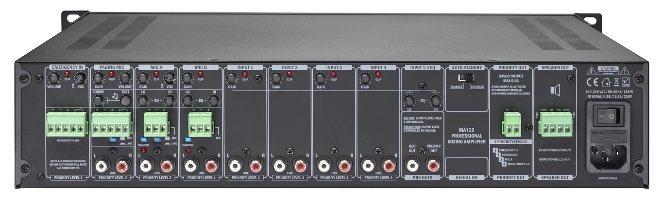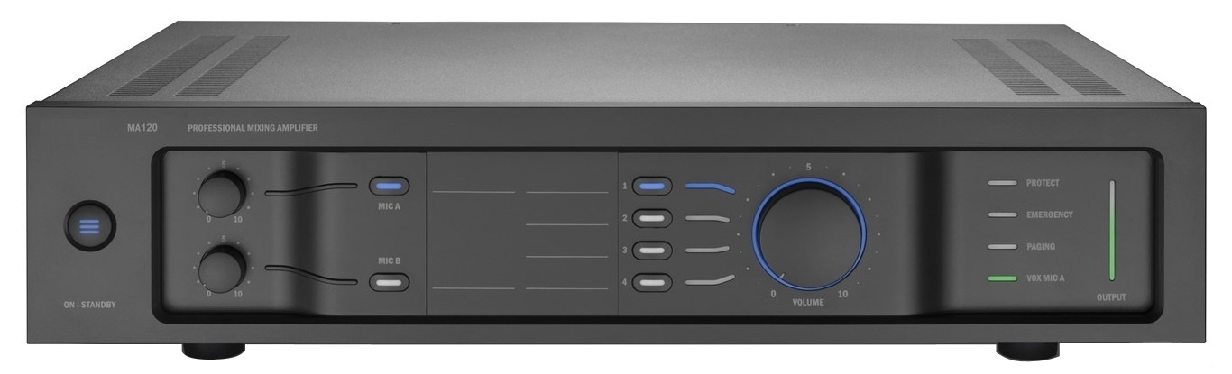 BIAMP MA120 – компактный цифровой микшер-усилитель с расширенным функционалом, современным дизайном и максимально простой эксплуатацией. Он позволяет подключать множество источников сигналов, управлять микшированием и усилением с последующей выдачей на линии акустических систем (4 Ом или 70/100 В) в соответствии с установленной системой приоритетов. Эффективно используется при построении стационарных и портативных звуковых систем различной сложности и назначения. Отлично подойдет для озвучивания бара, кафе или ресторана, музыкального оформления магазина и супермаркета, музыкального сопровождения семинаров и лекций, организации праздников и многого другого.