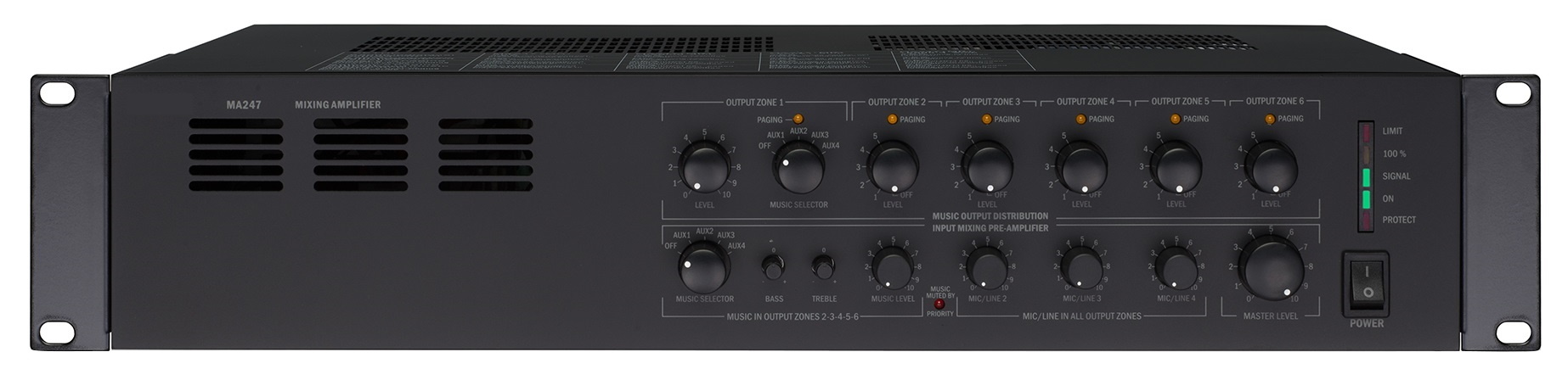 BIAMP MA247 – многофункциональный микшер-усилитель профессионального класса с обширными возможностями применения и довольно простым управлением, предназначенный для построения систем озвучивания и оповещения различной сложности и назначения. Он позволяет подключать множество источников сигналов, управлять их микшированием, уровнем усиления, тембром и др. с последующей выдачей в 6 зон озвучивания в соответствии с установленной системой приоритетов. При этом встроенный УМ обеспечивает мощность на уровне 240 Вт, а возможность запитки от источника DC 24 В позволяет использовать микшер как в стационарных системах озвучивания и оповещения, так и в портативных звуковых установках.