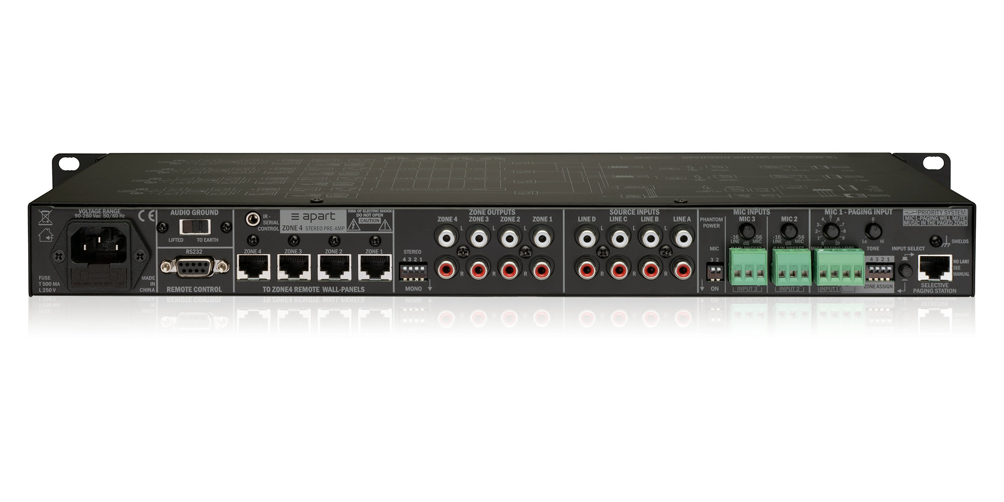 Управление ZONE4 возможно с помощью органов управления на передней панели, через RS232 соединения или IR. Настенные панели управления предусилителем позволяют контролировать уровень музыки, уровень микса, выбор источника и "mute". Поставляется в комплекте с 19" съёмными кронштейнами. Также в комплект поставки входят съёмные крышки для защиты настроек микрофонных входов.