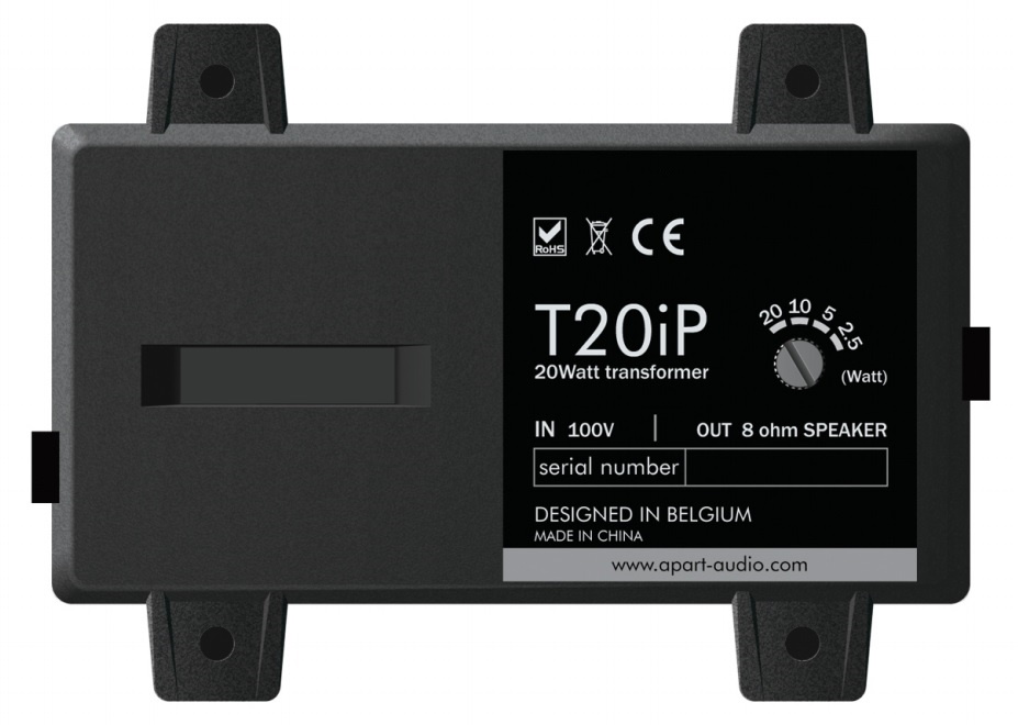 BIAMP T20IP – согласующий трансформатор для подключения акустических систем с импедансом 8 Ом к трансляционным линиям с напряжением 100 В. Выполнен во влагостойком пластиковом корпусе черного цвета и снабжен поворотным селектором (под отвертку) выбора мощности 20/10/5/2.5 Вт. К акустическим линиям подключается через гермоввод.